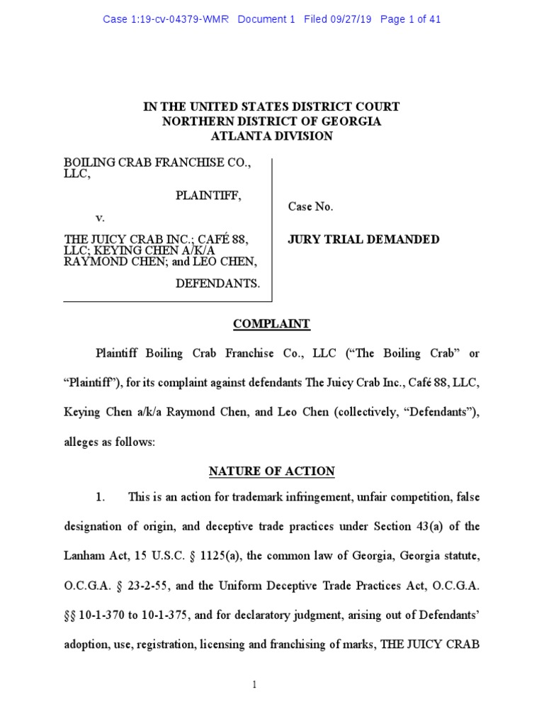 Boiling Crab V The Juicy Crab Complaint Pdf Trade Dress Lanham Act